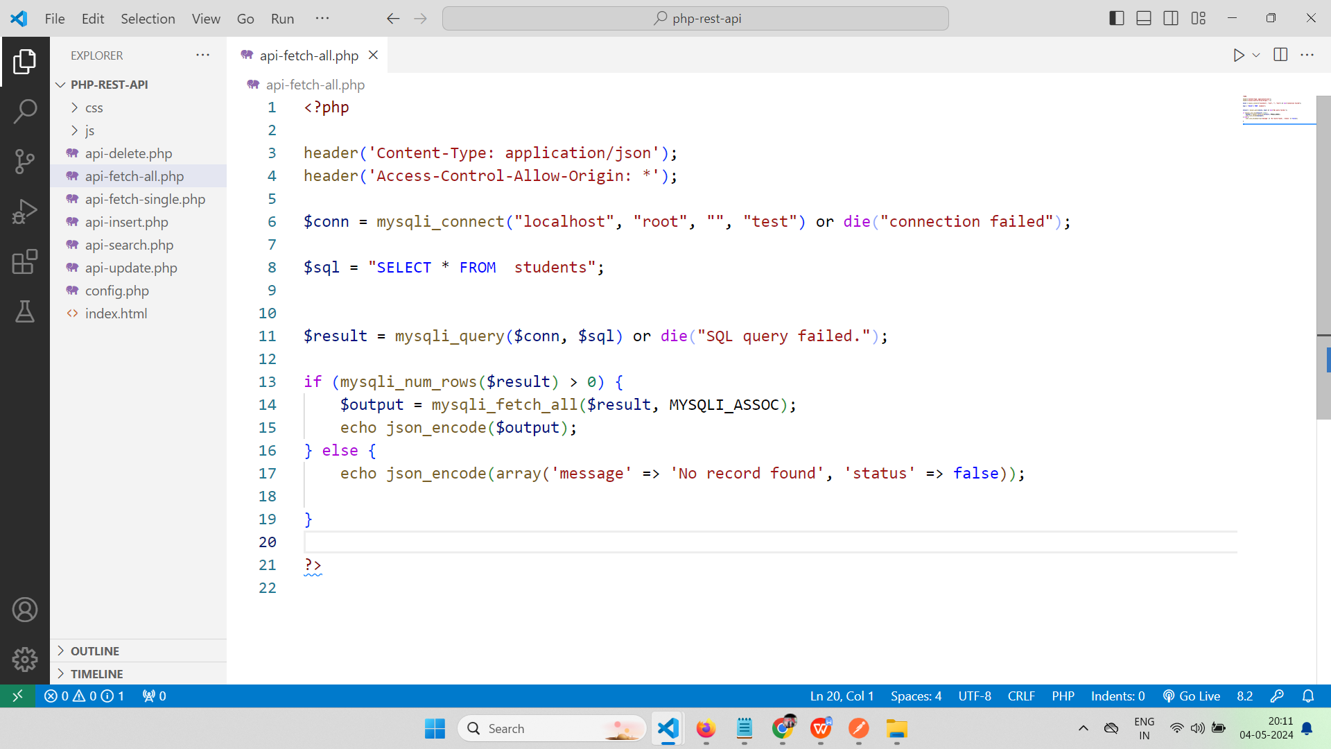 - Now, go to the write path and give file name in which you have written above code as http://localhost/php-rest-api/api-fetch-all.php
